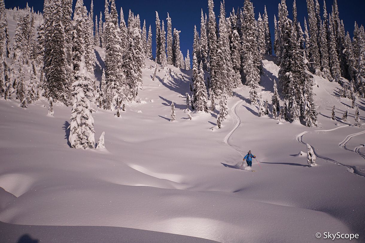 When it is snowing lots in southern British Columbia all operations have great powder skiing. However, it is during the dry spells when Mustang’s monstrous amount of terrain (especially north aspect terrain) will still provide good untracked powder skiing.
